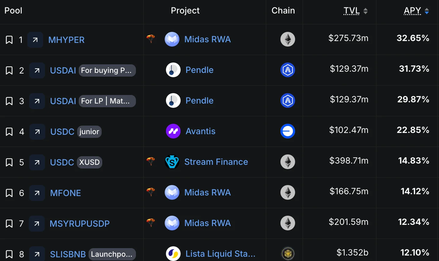 • Midas 系列池(mHYPER / mFONE / mSYRUPUSDP):收益高达 30% 但成分复杂,背后涉及多层资产与策略,需警惕管理方及底层资产风险。