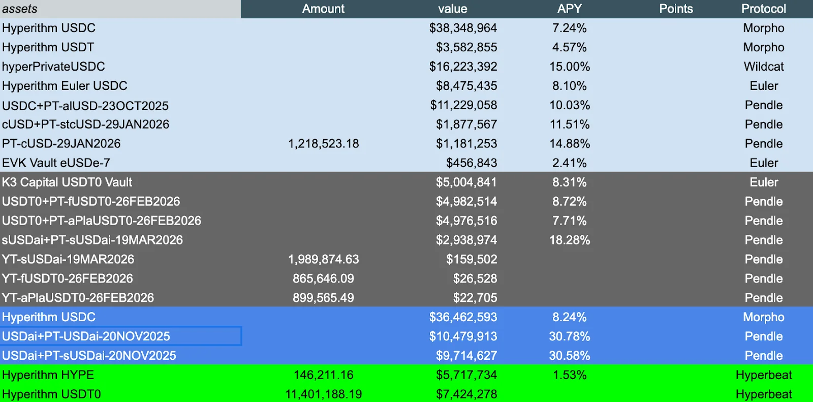 mHYPER 在图中的收益显示为 30% 以上,经验丰富的玩家可以一眼看出这里面肯定有些「奇奇怪怪」收益藏在里面。果然,当我们从 Midas 大使的结构表格中可以看出,小小的  mHYPER 背后藏着这么多资产和策略。这才是用户需要真正关注的。